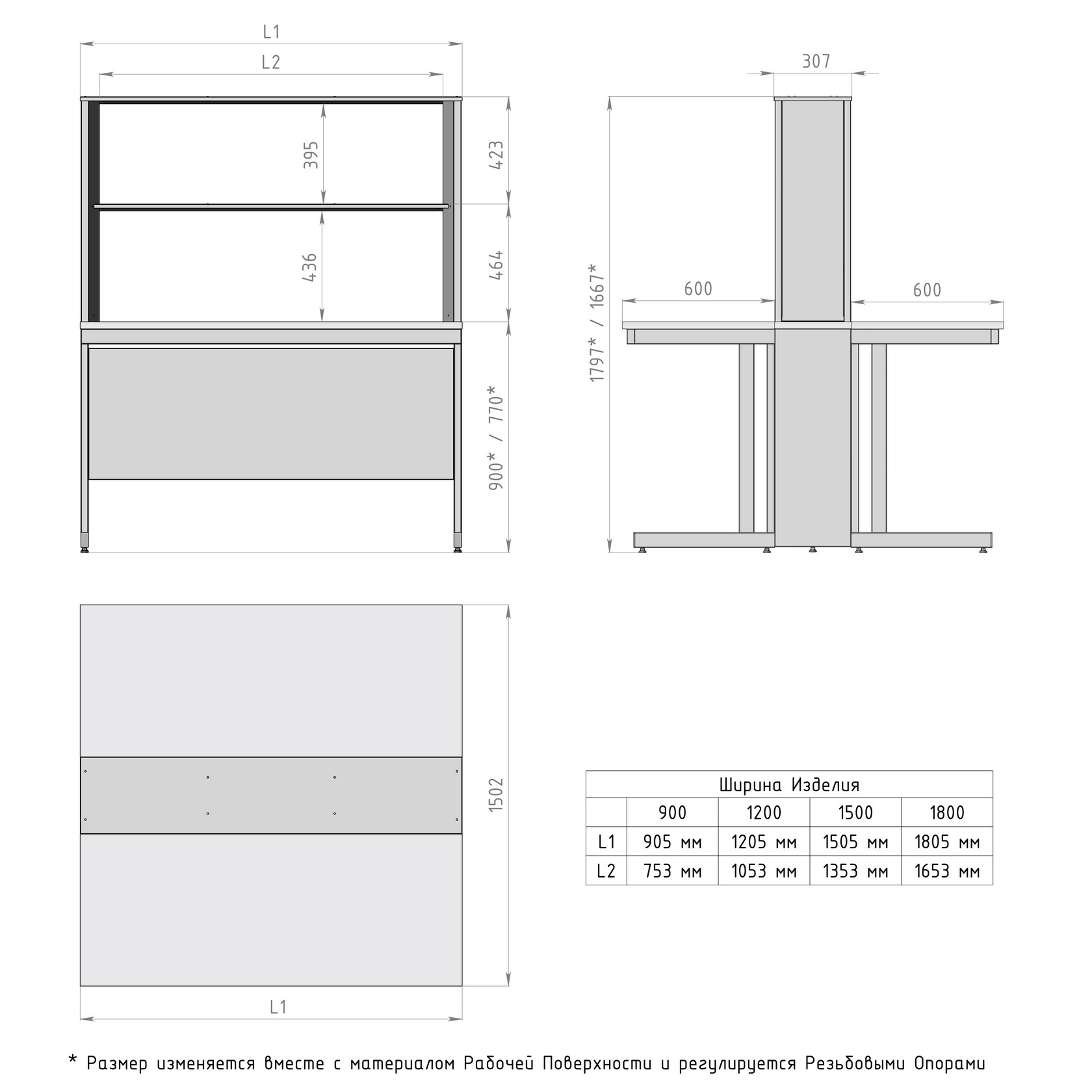 В каркасе лабораторного стола предусмотрены регулируемые опоры в диапазоне 0-30 мм для компенсации неровностей пола.
