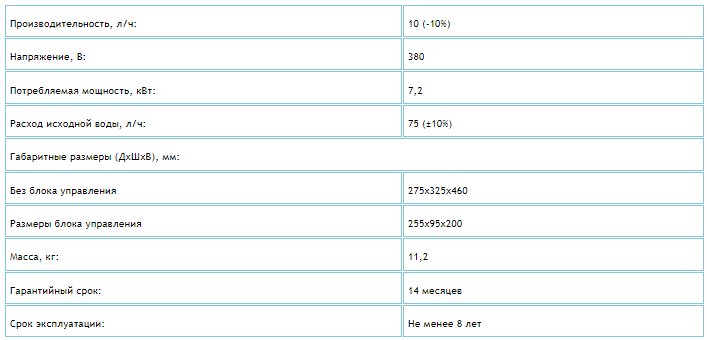 - Низкий удельный расход электроэнергии для получения 1 литра дистиллированной воды.