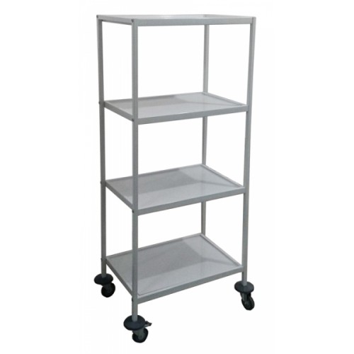 Каркас изготовлен из стального профиля окрашенного экологически чистой полимерно-порошковой краской. Установлен на поворотные колесные опоры диаметром 75 мм, две из которых с тормозом. Колесные опоры самоориентирующиеся, из немаркой серой резины. Четыре съемные полки - из листовой стали толщиной 0,8 мм, окрашенной полимерно-порошковой краской. Стеллаж имеет разборную конструкцию, может поставлять в разобранном виде.