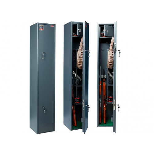 • толщина металла корпуса и двери – 2 мм оборудованы патронным отделением, запирающимся на ключ, полками и ложементами для ружей